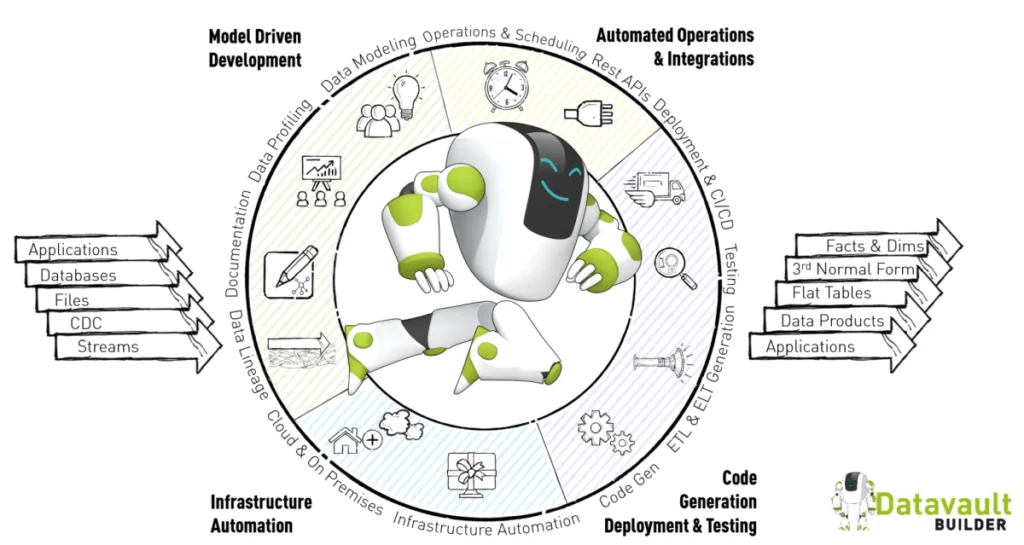 You save time and reduce risk: instead of hand-coding, you get automation, built-in governance, lineage, documentation, and ready-to-use standards like bi-temporality.